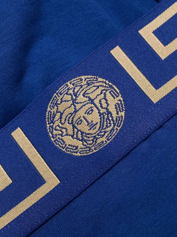 Greca-waistband bikini bottoms from VERSACE featuring blue, gold, elasticated waistband, signature Greca detailing, Medusa Head motif and stretch-design. Be mindful to try on swimwear over your own garments..