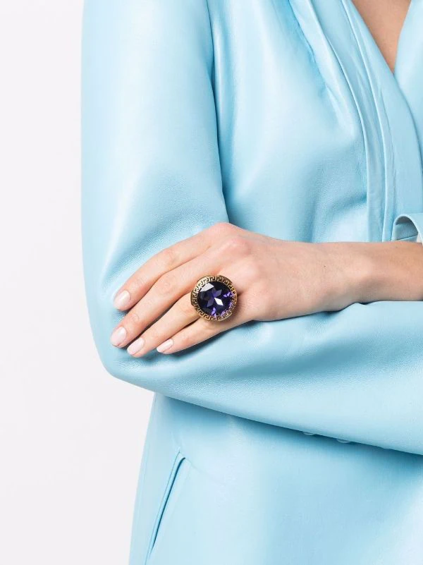 Finitions gravées, détail Greca signature, ornement en strass, bague cocktail. Matière : métal.