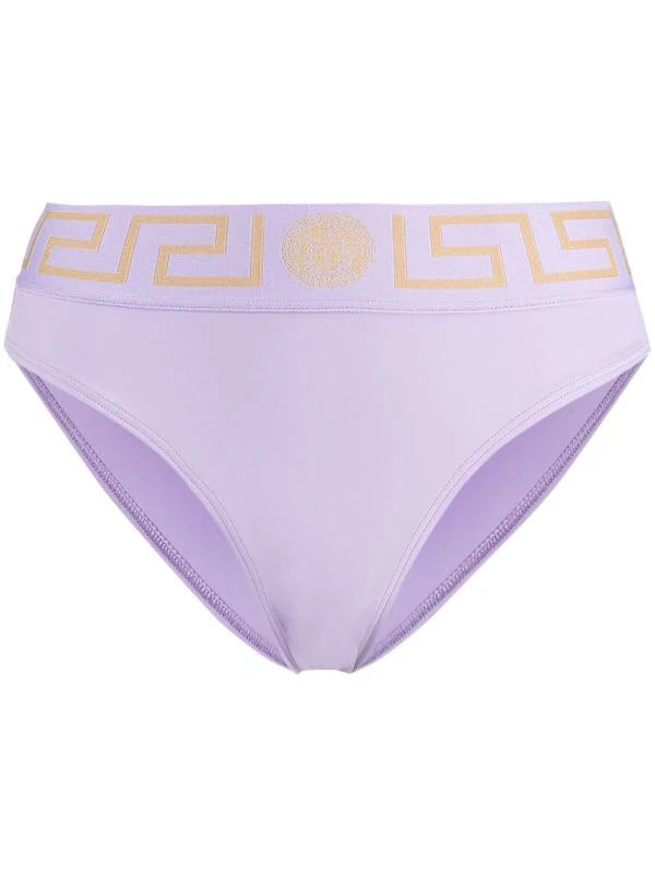 Détail Greca signature, motif Medusa, coupe échancrée. Veillez à essayer les maillot de bain par-dessus vos propres sous-vêtements.