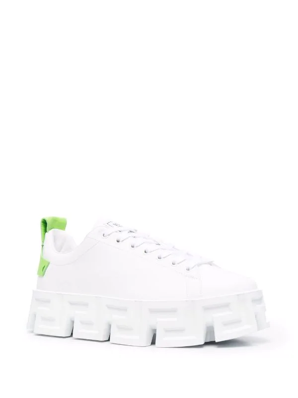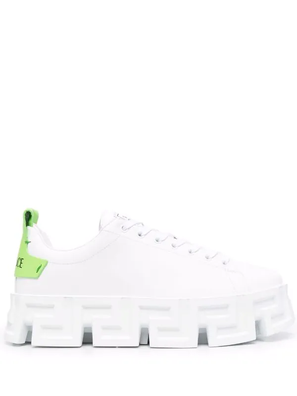 Bout rond, languette à patch logo, fermeture à lacer sur le devant, languette d’enfilage au talon, contrefort à logo, détail Greca signature, semelle épaisse en caoutchouc. Matière : cuir.