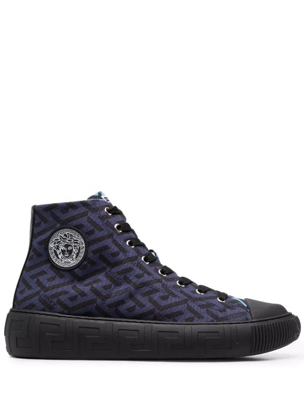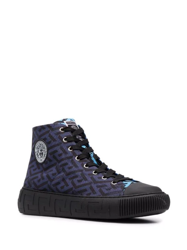 Imprimé La Greca signature, design à empiècements, languette à patch logo, bout en caoutchouc, fermeture à lacer sur le devant, semelle plate en caoutchouc.