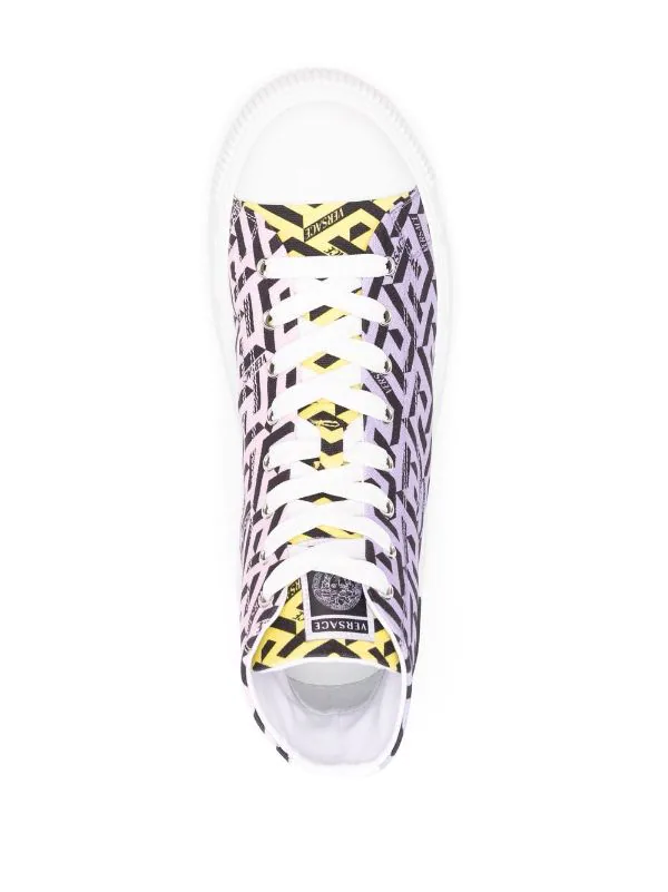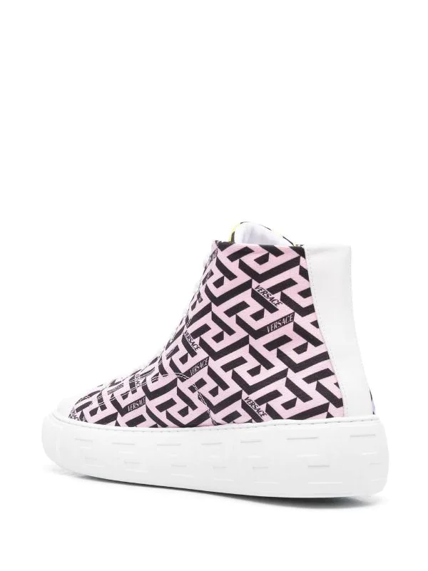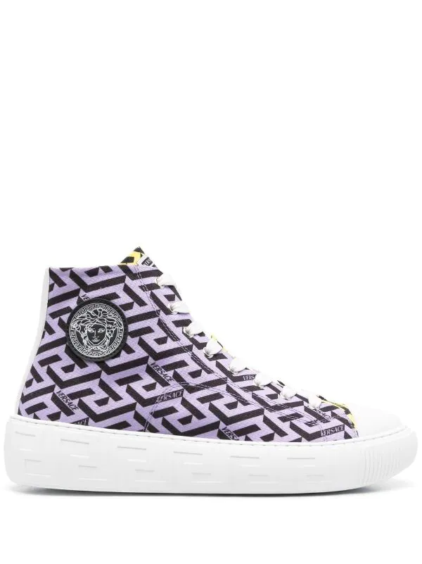 Motif Greca signature imprimé, motif Medusa, fermeture à lacer sur le devant, bout rond, semelle plate en caoutchouc, semelle intérieure à logo.
