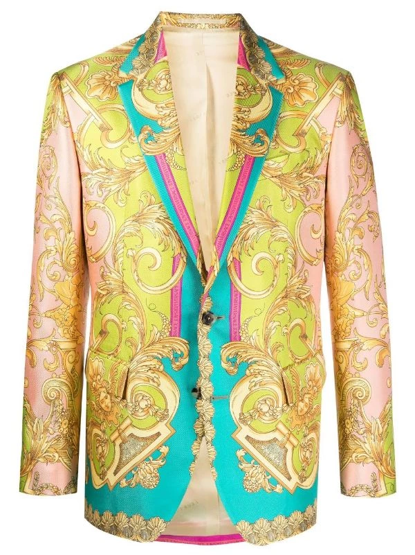 Multicolore, soie, motif baroque, revers crantés, boutonnière sur le devant, poches devant à rabat, manches longues, ourlet incurvé.