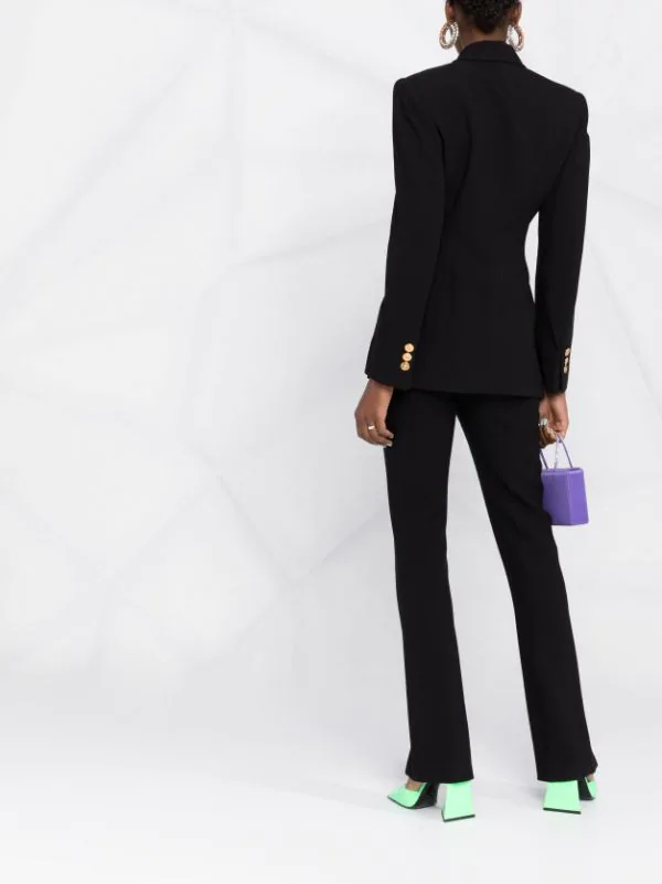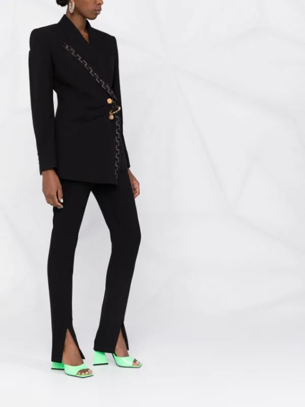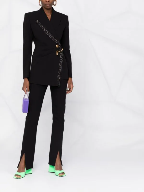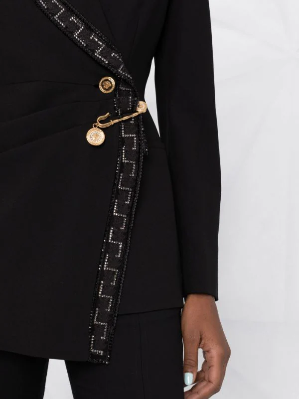 Détail Greca signature, revers pointus, poche passepoilée sur la poitrine, ornement en strass, col v, manches longues, poignets boutonnés, détail d’épingle Medusa signature, finitions en métal doré. Couleur : noir.