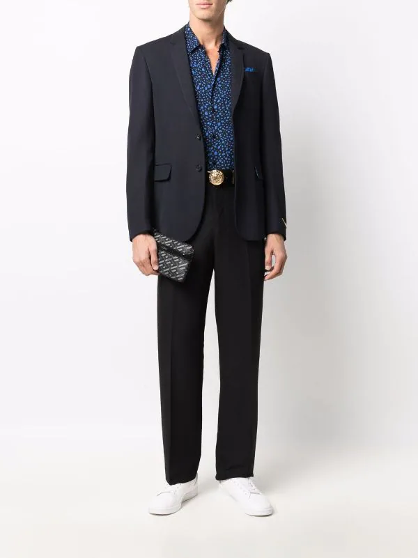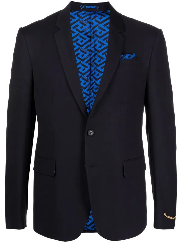 Revers crantés, motif Greca signature imprimé, manches longues, poche poitrine plaquée, breloque à logo, bordures en chaîne, poignets boutonnés, boutonnière sur le devant, deux poches à rabat sur le devant, fente arrière centrale. Matière : coton.