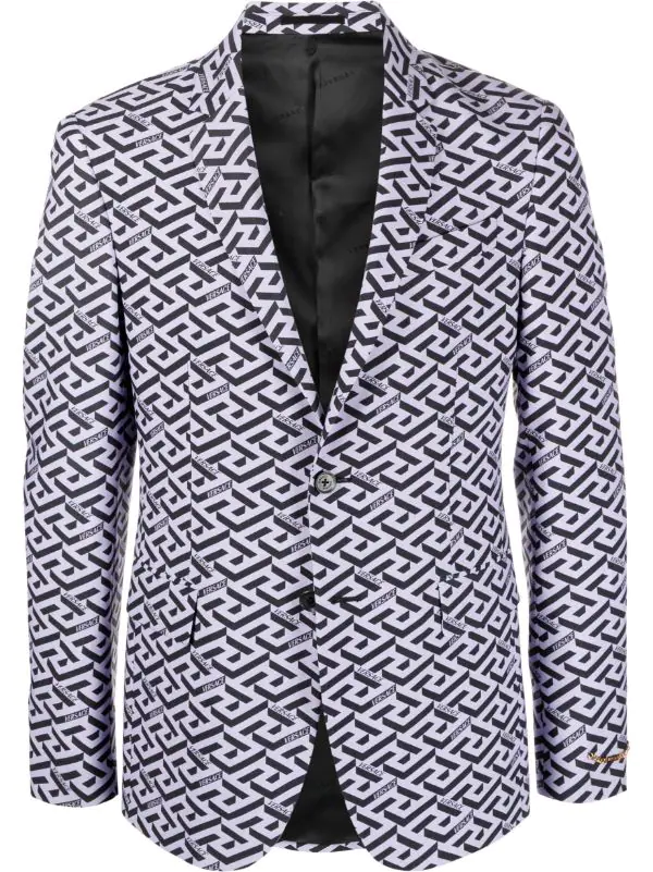 Imprimé La Greca signature, coupe ajustée, boutonnière sur le devant, revers crantés, poche passepoilée sur la poitrine, poches latérales à rabat, manches longues, poignets boutonnés, doublure en satin.