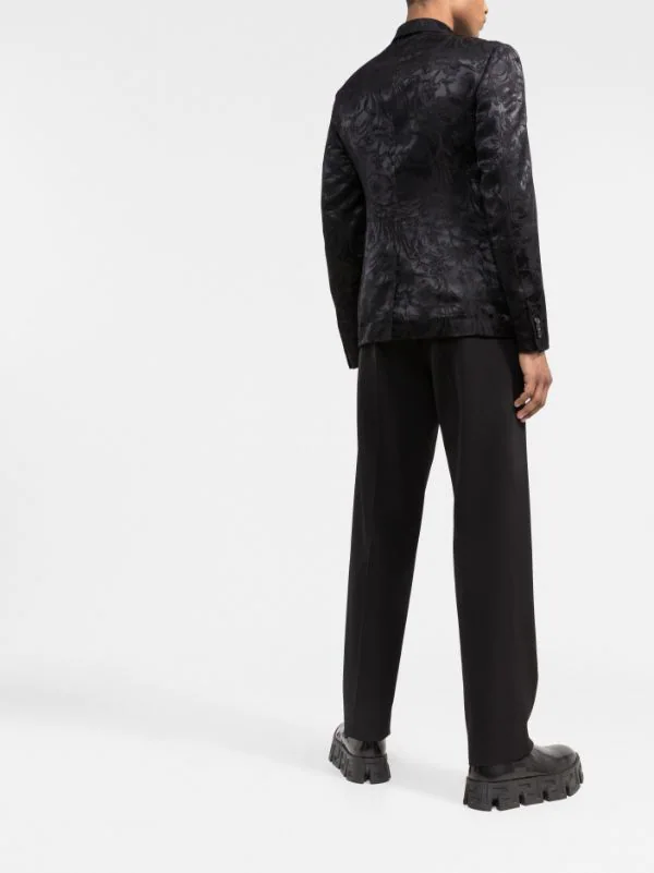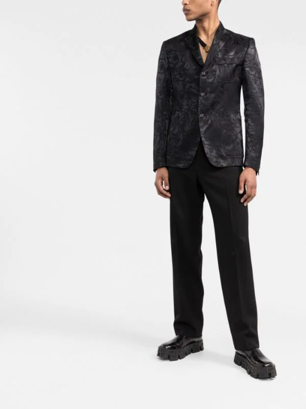 Motif Medusa, jacquard à motifs, motif de fleurs, revers crantés, boutonnière sur le devant, poche poitrine plaquée, deux poches latérales plaquées, fente arrière centrale, doublure intégrale. Couleur : noir.