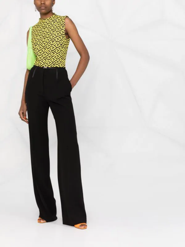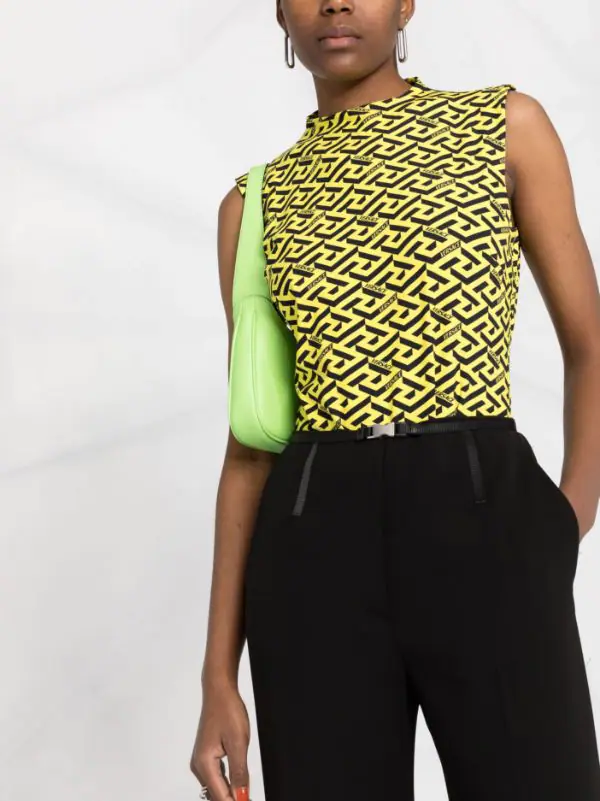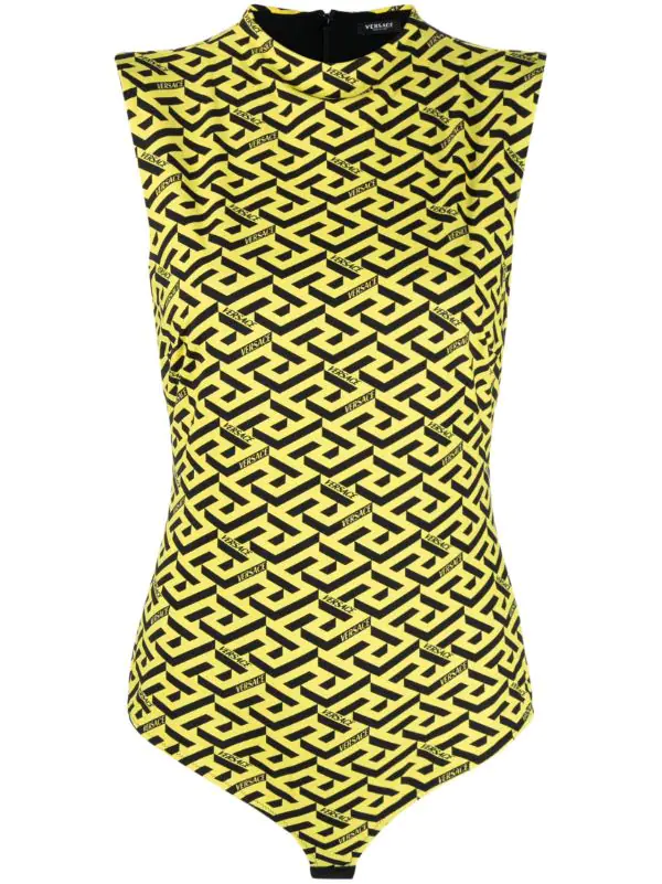 Col montant, design sans manches, construction stretch, imprimé La Greca signature, fermeture à boutons pression. N’oubliez pas : cet article doit être essayé par-dessus vos propres vêtements.