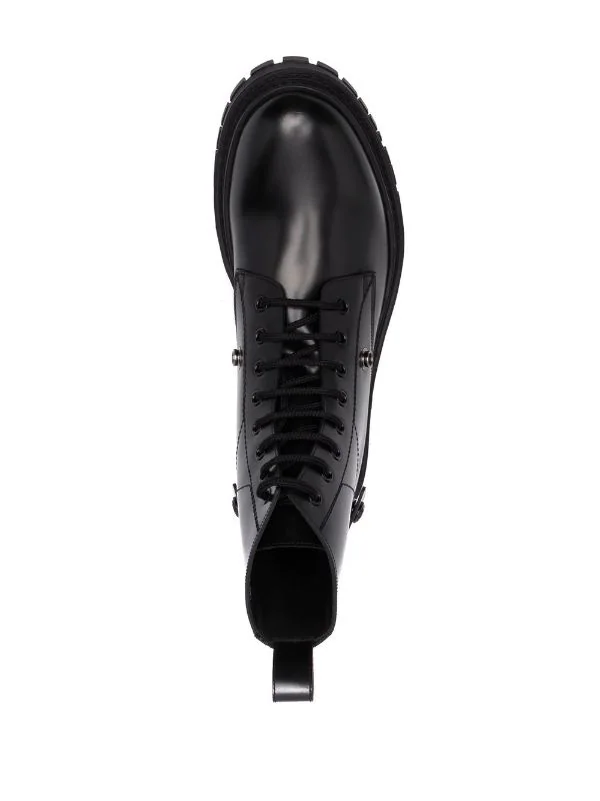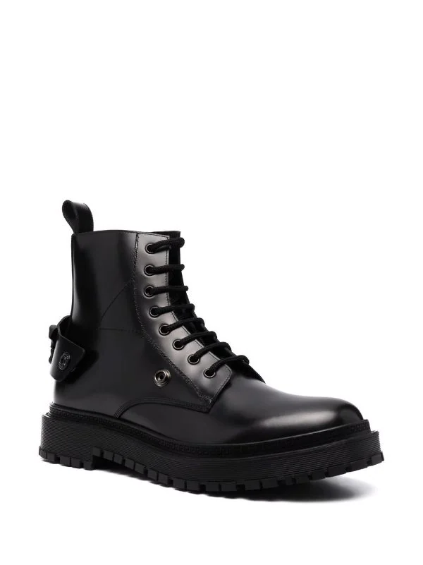 Motif Medusa, design ton sur ton, hauteur cheville, languette d’enfilage au talon, bout rond, fermeture à lacer sur le devant, semelle en caoutchouc. Couleur : noir. Matière : cuir.