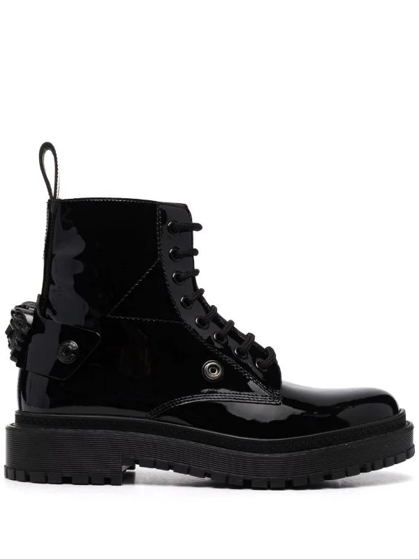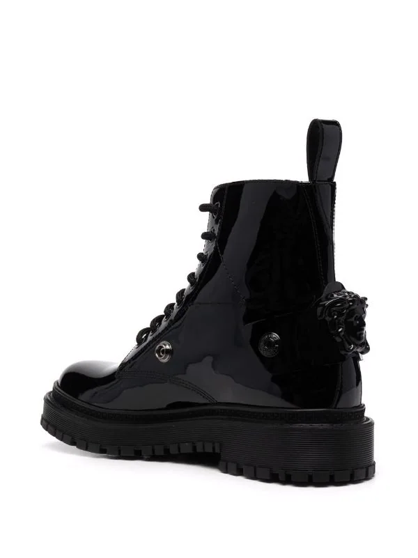 Détail Medusa, fermeture à lacer sur le devant, languette d’enfilage au talon, bout rond, semelle crantée en caoutchouc. Couleur : noir. Matière : cuir.
