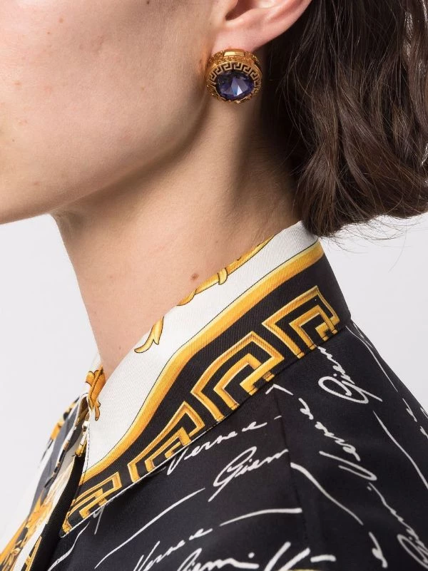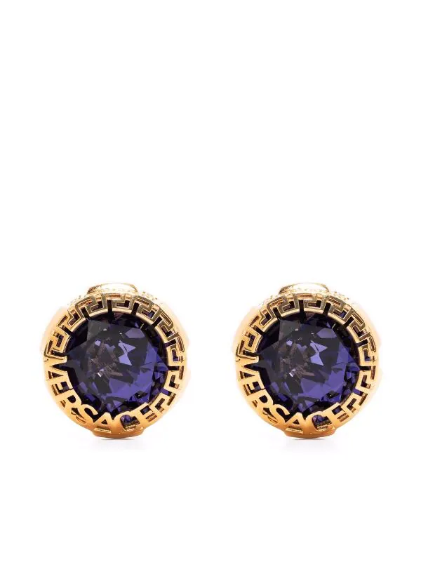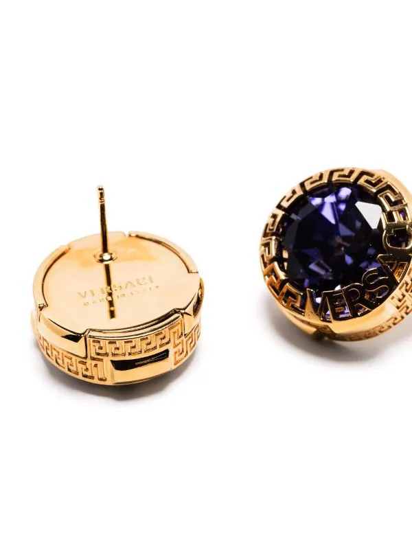 Logo gravé, détail Greca embossé signature, ornements en cristal de verre, fermoir épingle. Ces boucles d’oreilles sont vendues par paire.