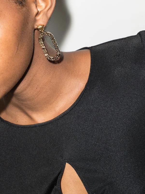 Design pendant, motif Medusa, détail Greca signature, logo lettre, fermoir épingle. Ces boucles d’oreilles sont vendues par paire.