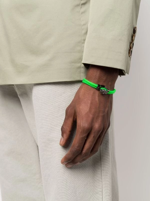 Détail Medusa, bande à design tressé, logo gravé, finitions en métal argenté.