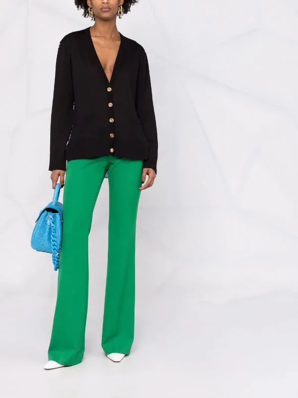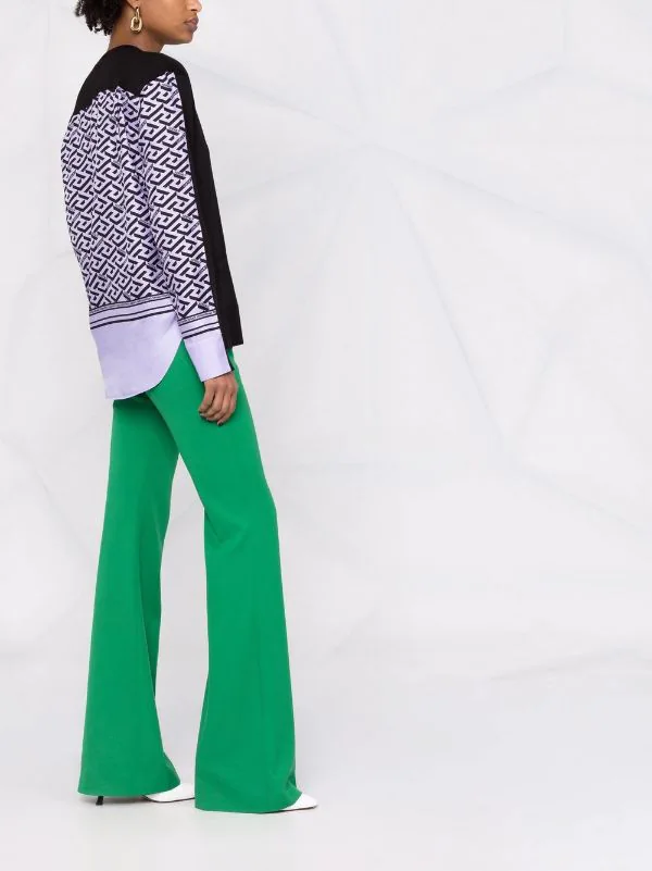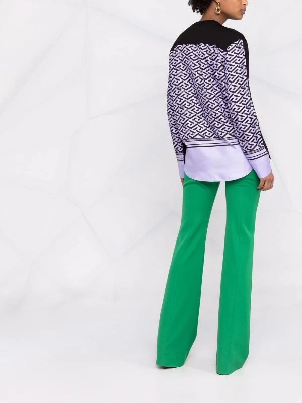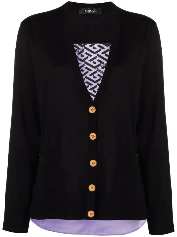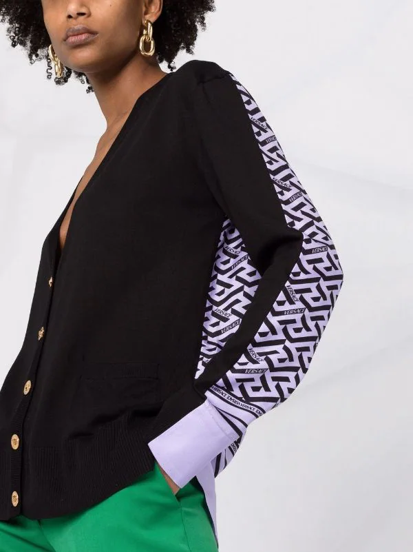 Design à empiècements, col v, boutonnière sur le devant, boutons à logo embossé, deux poches plaquées avant, manches longues, imprimé La Greca signature, ourlet incurvé au dos.