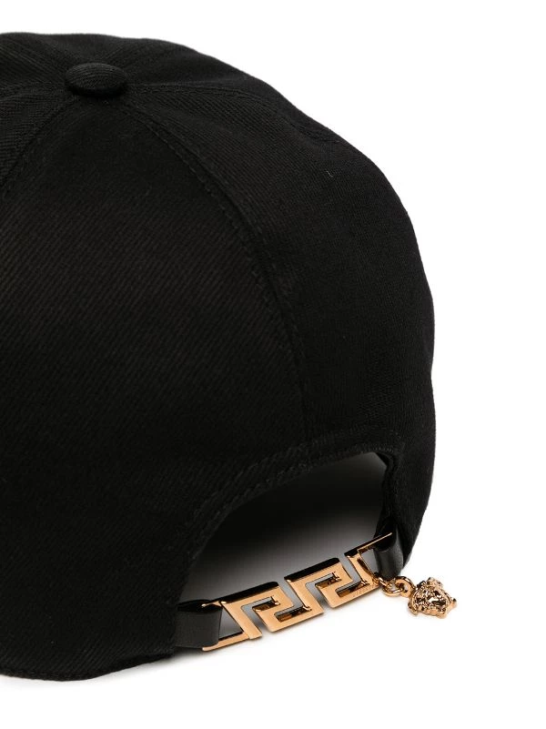 Design à six empiècements, logo brodé sur le devant, détail Greca signature, finitions en métal doré, bord incurvé. Matière : coton.