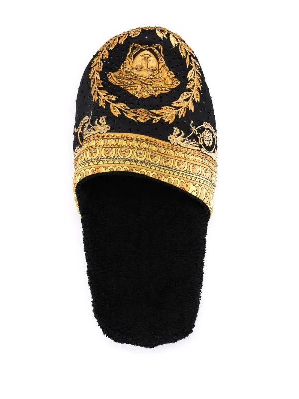 Motif baroque, motif Medusa, ornement en strass, tissu éponge, bout rond, design à enfiler, semelle plate. Matière : coton.