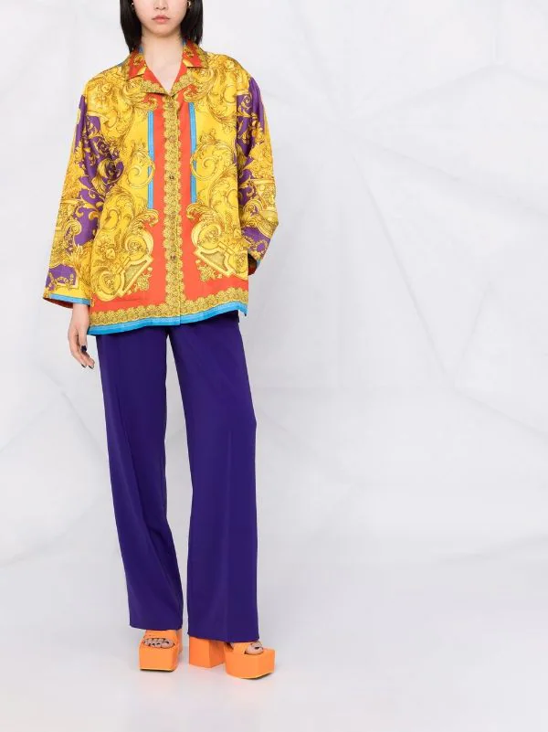 Imprimé Medusa Renaissance signature, fluide, col italien, boutons dorés à détails embossés, épaules tombantes, manches larges, deux poches plaquées avant, finitions à logo, ourlet droit. Couleur : multicolore. Matière : soie.