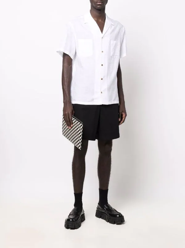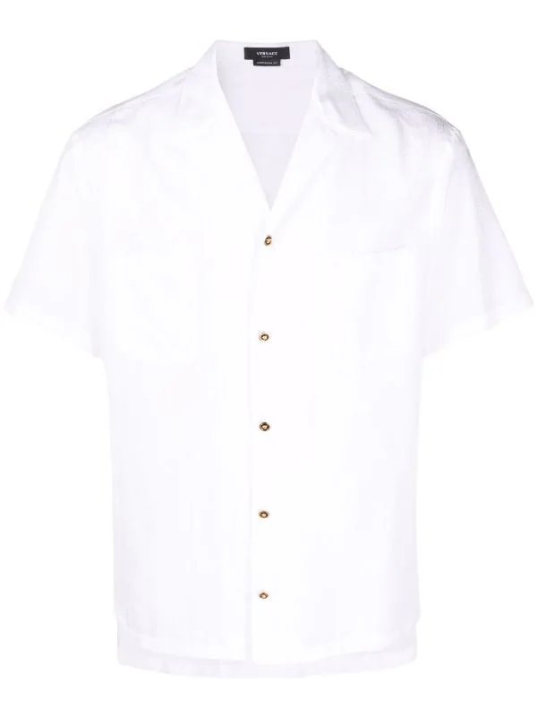 Col cranté, boutonnière sur le devant, deux poches poitrine plaquées, manches courtes, fentes latérales.