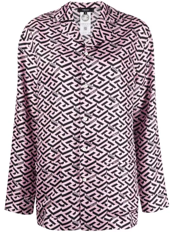 Motif Greca signature imprimé, manches longues, col cranté, boutonnière sur le devant. Matière : soie.