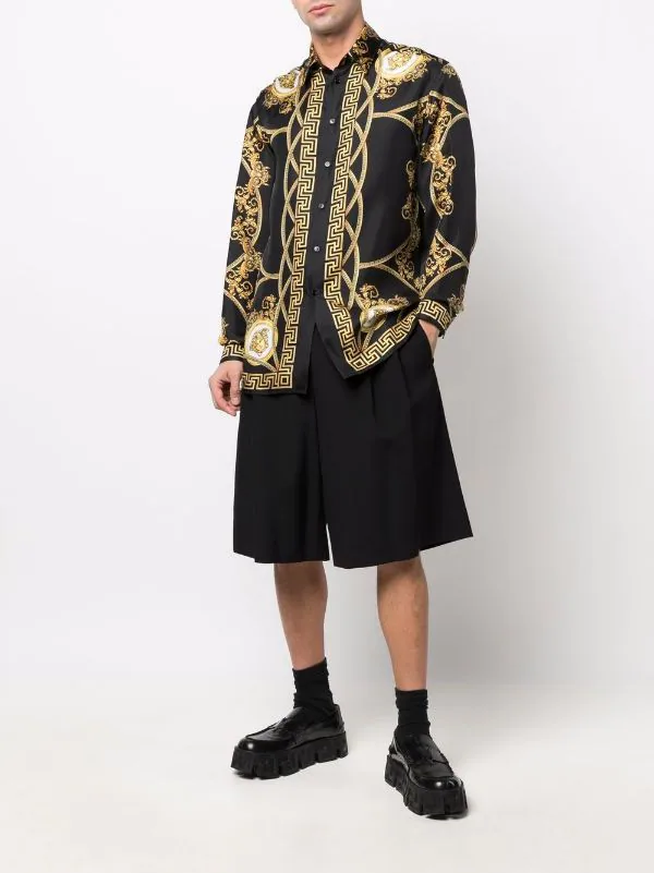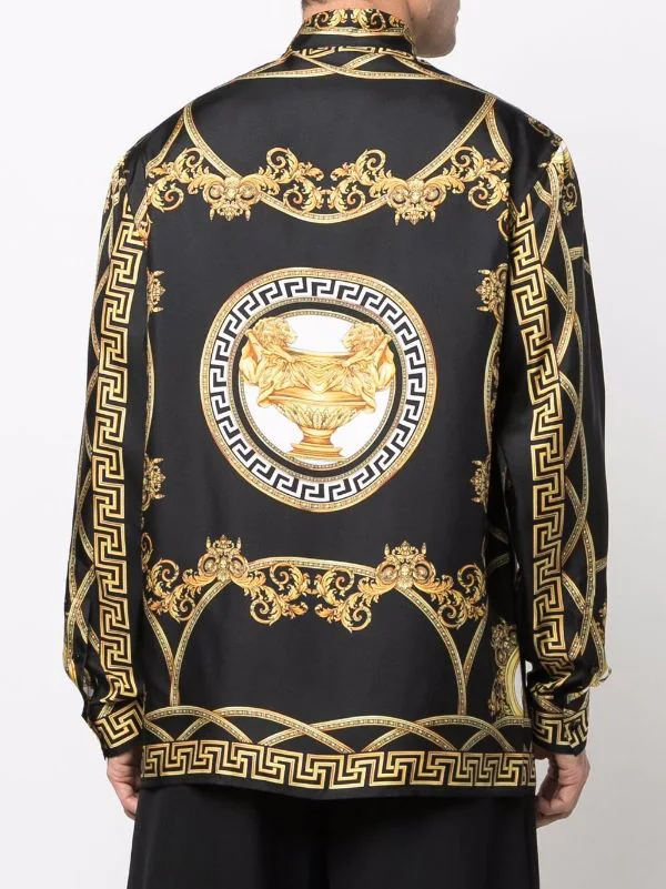 Structure légère, motif Medusa, motif baroque, motif Greca signature imprimé, col classique, boutonnière sur le devant, manches longues, poignets boutonnés. Couleur : noir. Matière : soie.