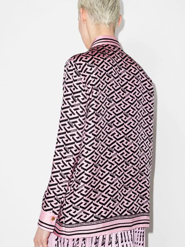 Tissage satin, imprimé La Greca signature, fermeture dissimulée sur le devant, poignets boutonnés. Matière : soie.
