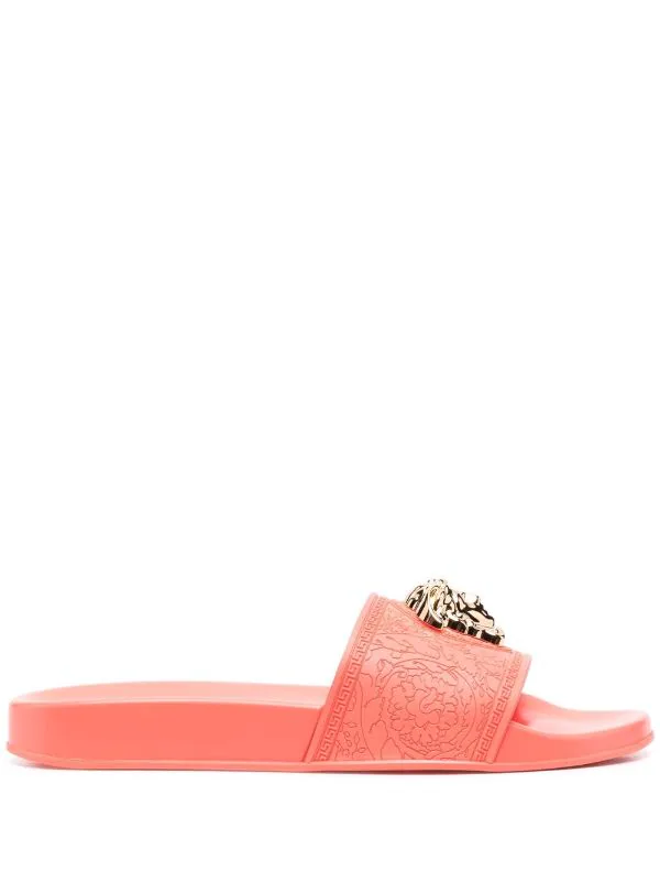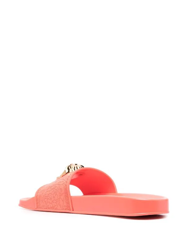 Bout ouvert, semelle intérieure à logo, design à enfiler, semelle plate en caoutchouc, motif Medusa. Couleur : orange.