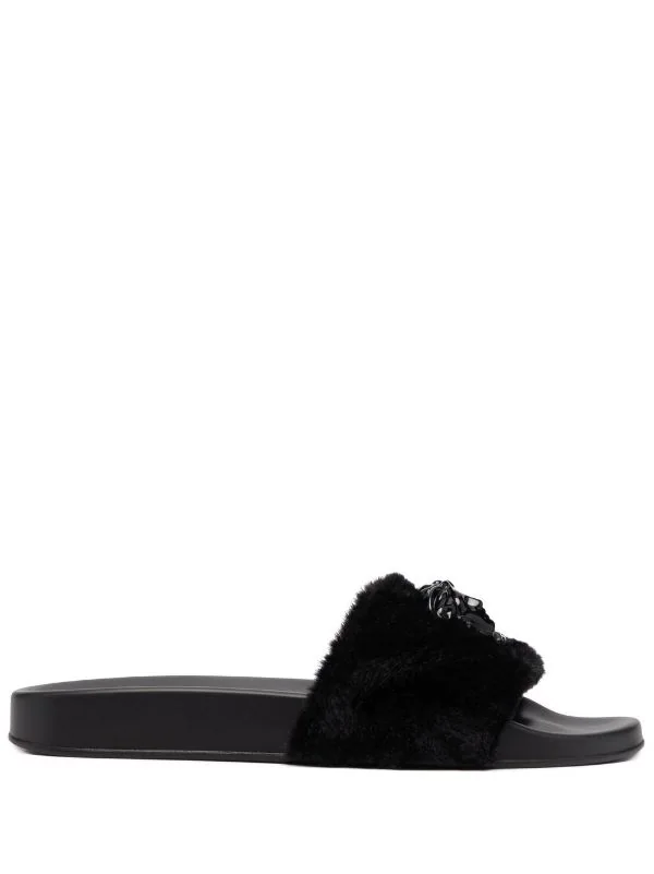 Détail Medusa, détails en fourrure artificielle, bout ouvert, design à enfiler, semelle intérieure anatomique, semelle plate en caoutchouc. Couleur : noir.