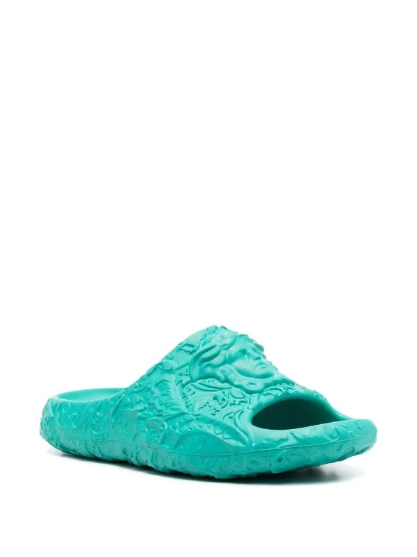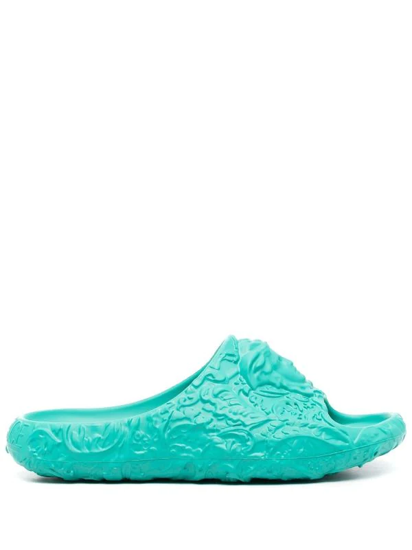 Turquoise, motif Medusa, bout ouvert, design à enfiler, semelle intérieure à logo, semelle plate en caoutchouc.