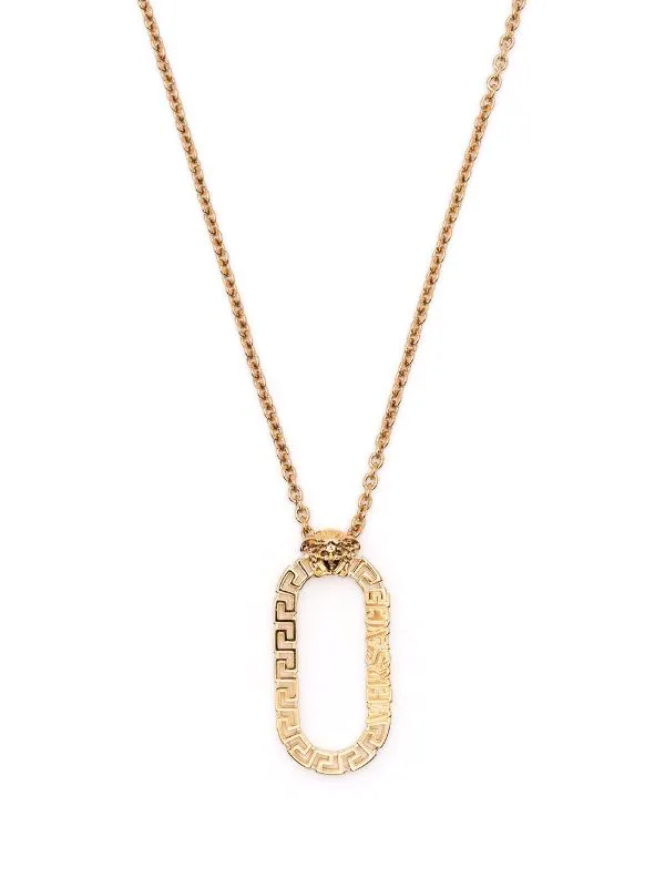 Détail Greca signature, motif Medusa, logo lettre, fermoir mousqueton, maille jaseron, fermoir anneau à ressort. Matière : laiton.