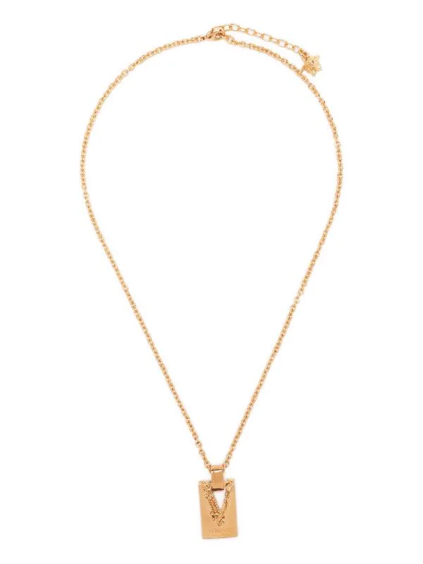 Détail de logo Virtus signature, maille jaseron, fermoir mousqueton, taille ajustable. Matière : métal.