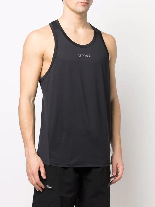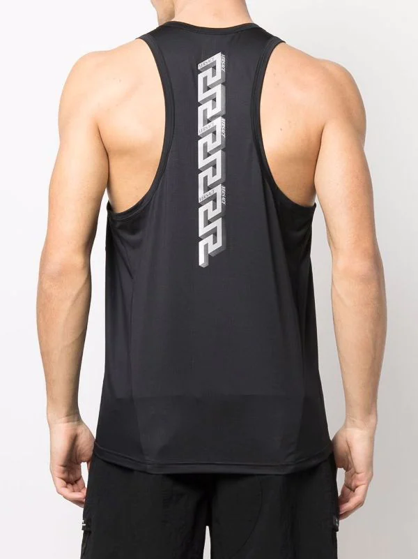 Encolure arrondie, logo imprimé sur le devant, design sans manches, dos nageur, imprimé La Greca signature, ourlet droit. Couleur : noir.