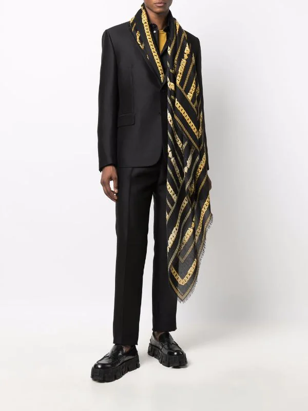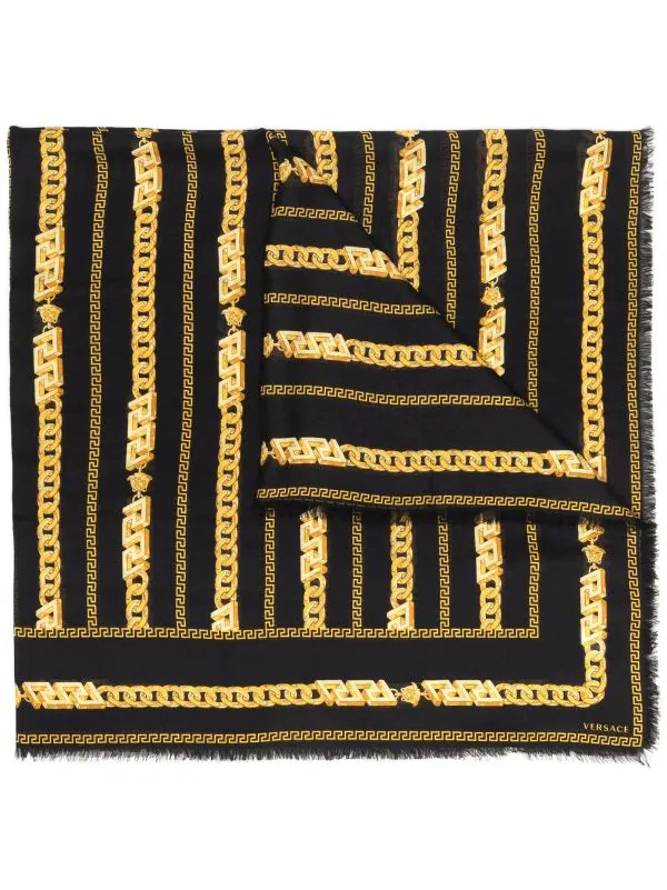 Modèle bicolore, motif Greca signature imprimé, bords frangés.