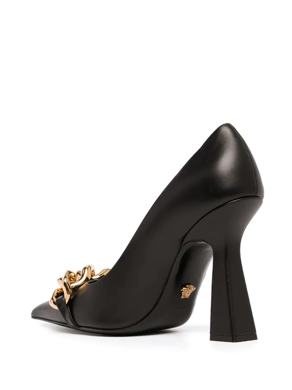 Maille gourmette, design à enfiler, bout pointu, semelle intérieure griffée, semelle en cuir, talon sculpté haut. Couleur : noir. Matière : cuir.