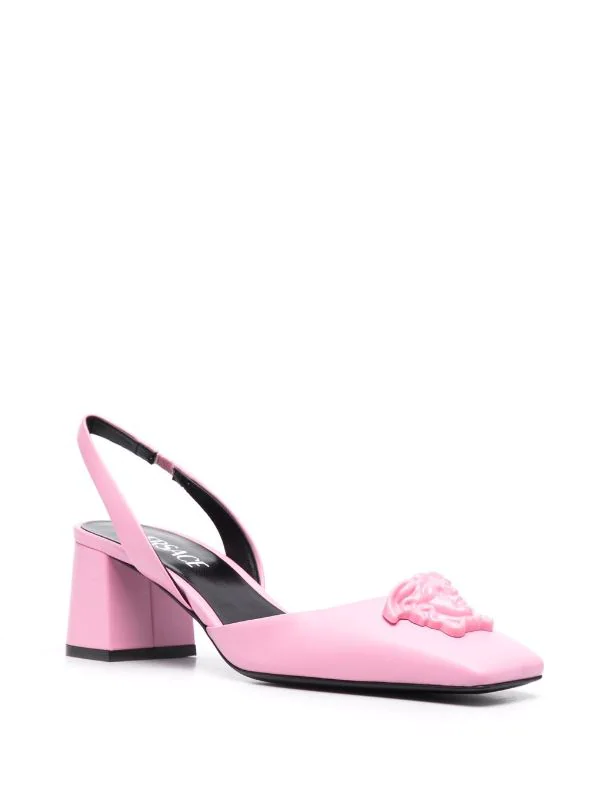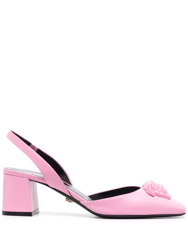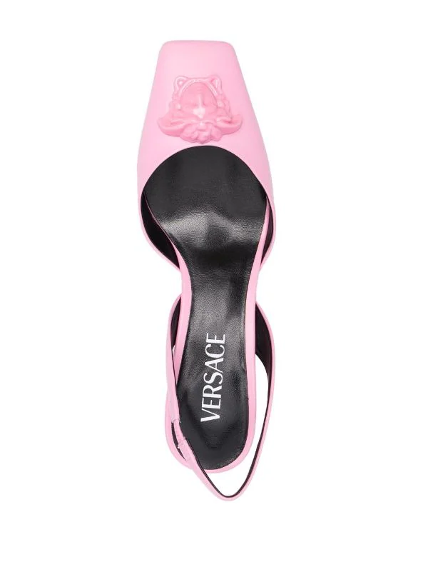 Motif Medusa, bout carré, bride arrière élastique, semelle intérieure griffée, semelle en cuir. Couleur : rose. Matière : cuir.