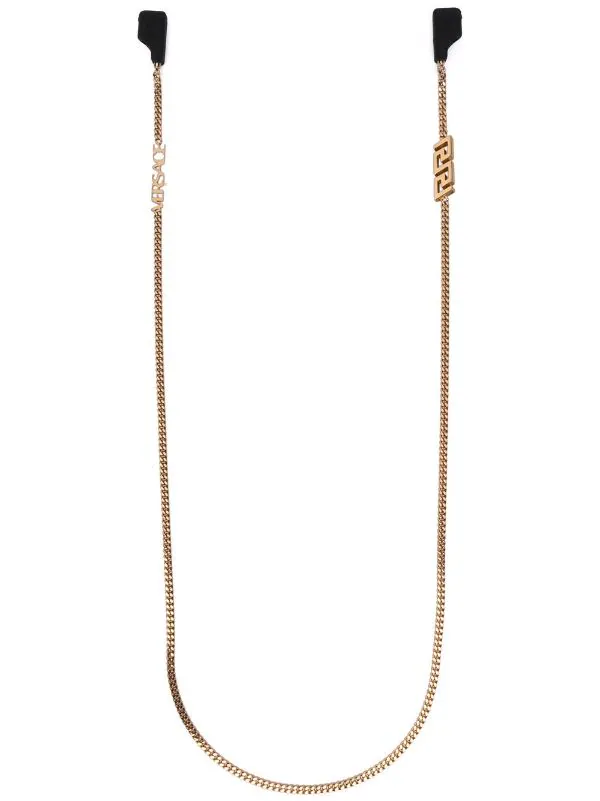 Détail Greca signature, plaque logo, finitions en métal doré, lanière autour du cou à maillons. Couleur : or.