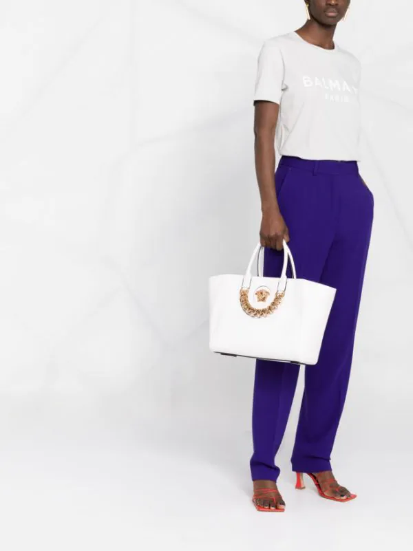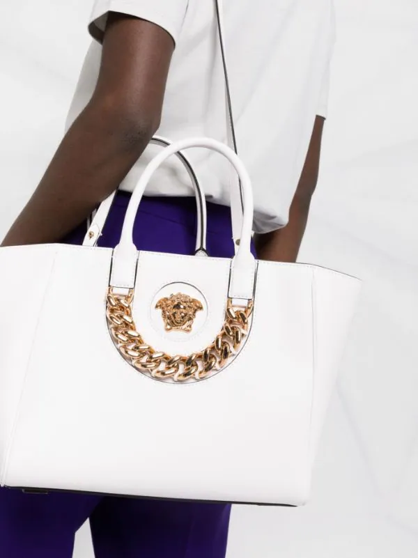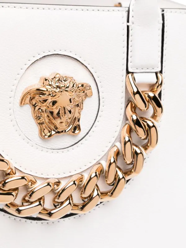 Motif Medusa, détails de chaînes, anses arrondies, bride porté épaule détachable et ajustable, ouverture sur le dessus, compartiment principal, poches intérieures zippées, attache porte-clés. Matière : cuir de veau.
