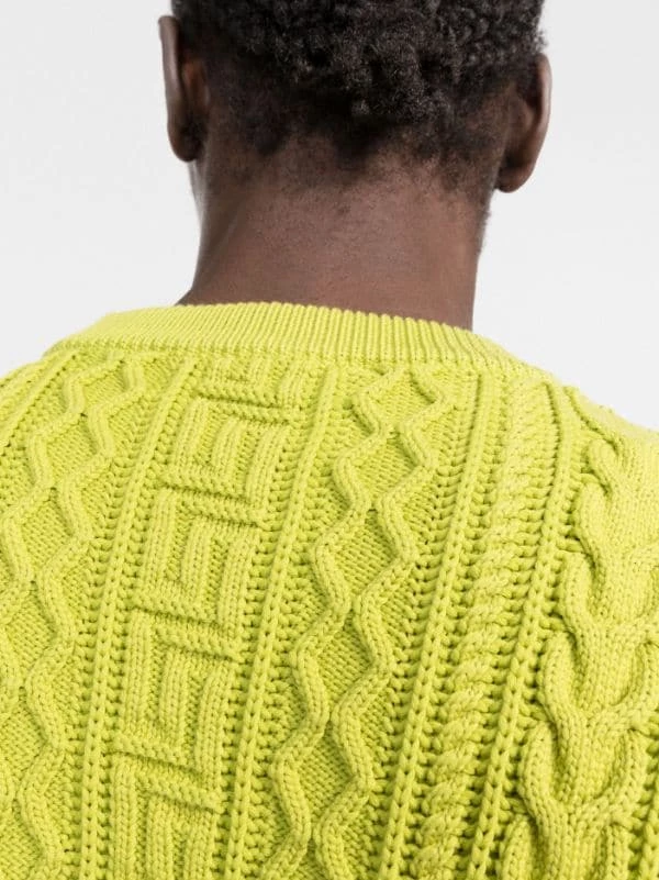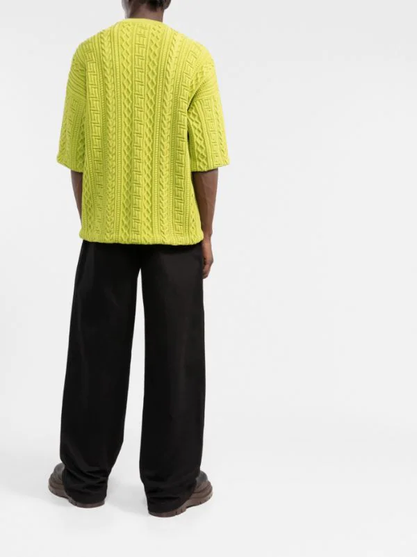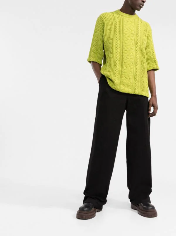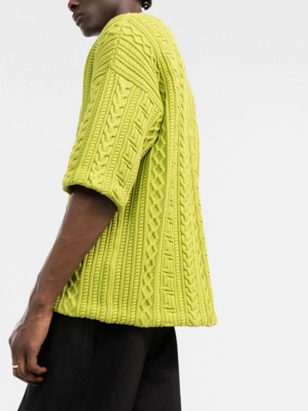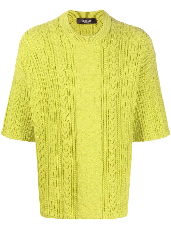 Maille épaisse, tricot torsadé, détail Greca signature, encolure ras du cou, épaules tombantes, manches courtes, ourlet droit.