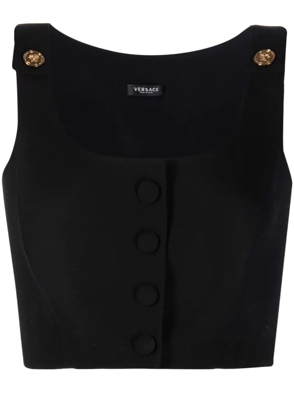 Motif Medusa, encolure arrondie, boutonnière sur le devant, design sans manches, ourlet droit, coupe courte. Couleur : noir.