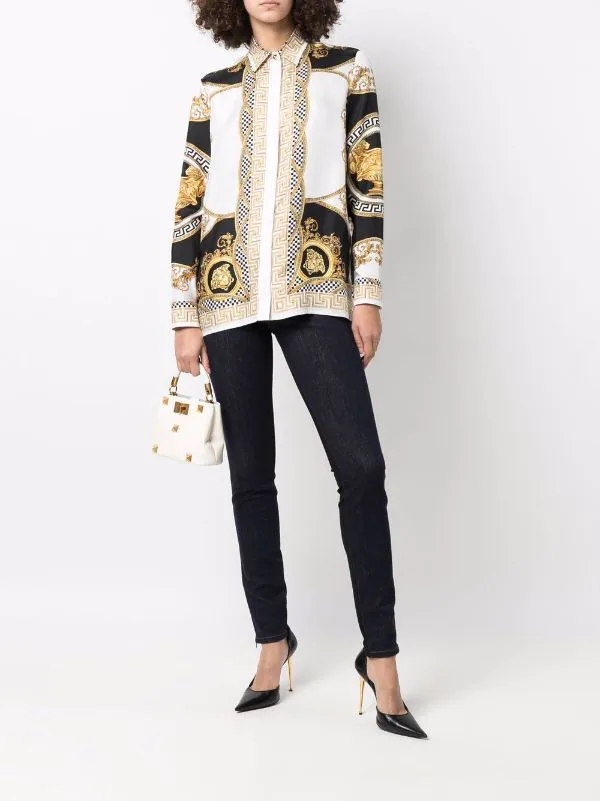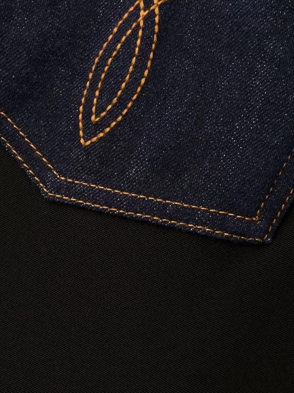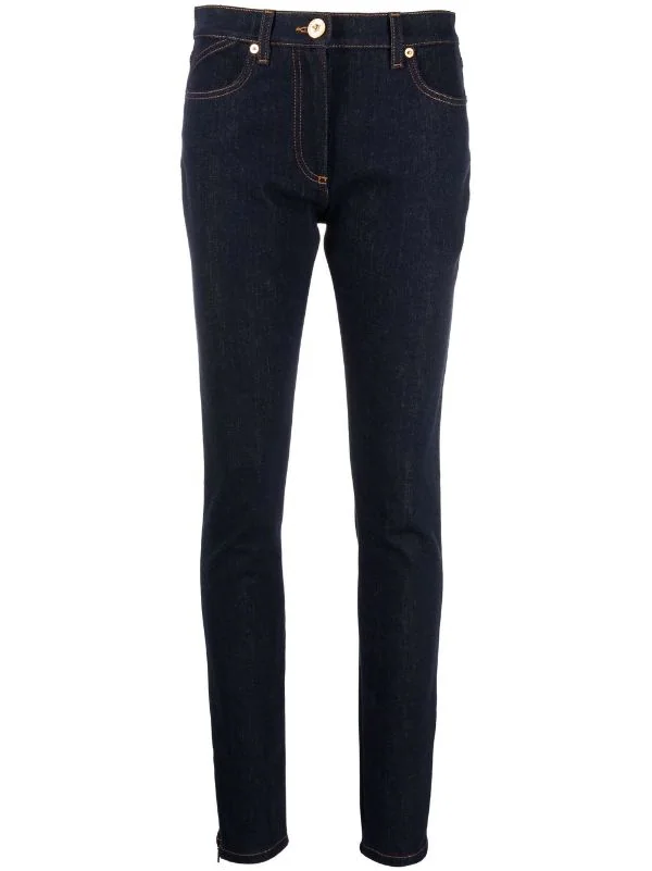 Taille mi-haute, coutures contrastantes, passants de ceinture, fermeture boutonnée, cinq poches classiques, patch logo sur l’arrière, coupe skinny. Matière : coton mélangé.