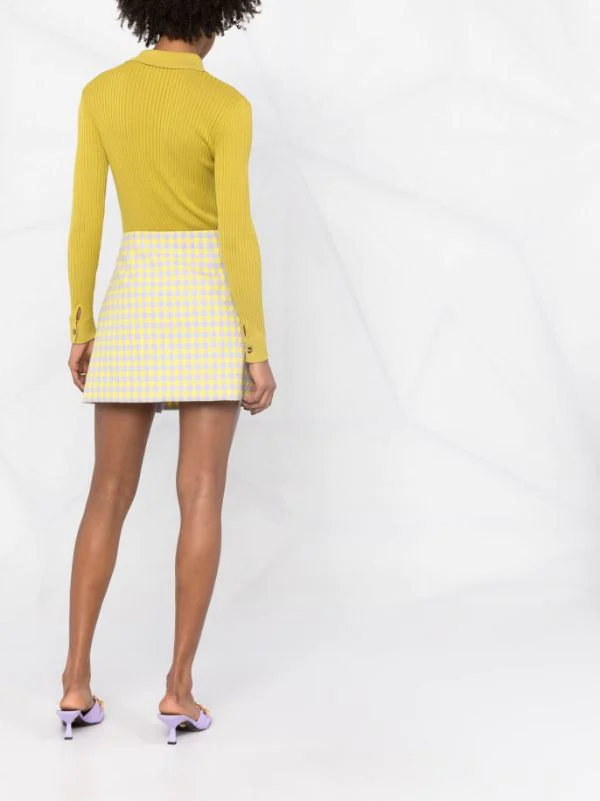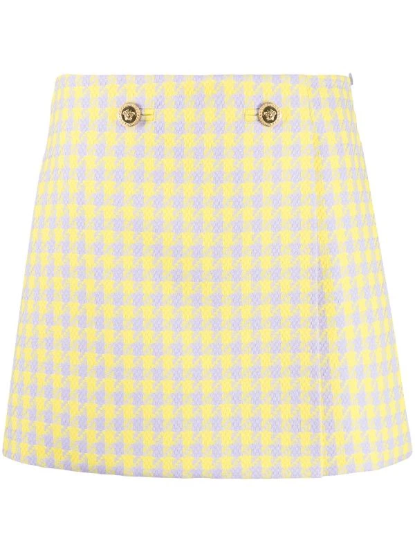 Carreaux, motif Medusa, boutons à logo embossé, design portefeuille, taille mi-haute, longueur au dessus du genou. Matière : laine vierge.