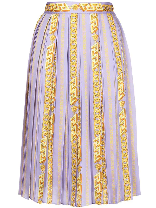 Design plissé, imprimé La Greca signature, taille haute, fermeture dissimulée sur le côté, coupe mi-longue.