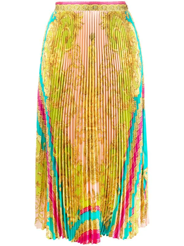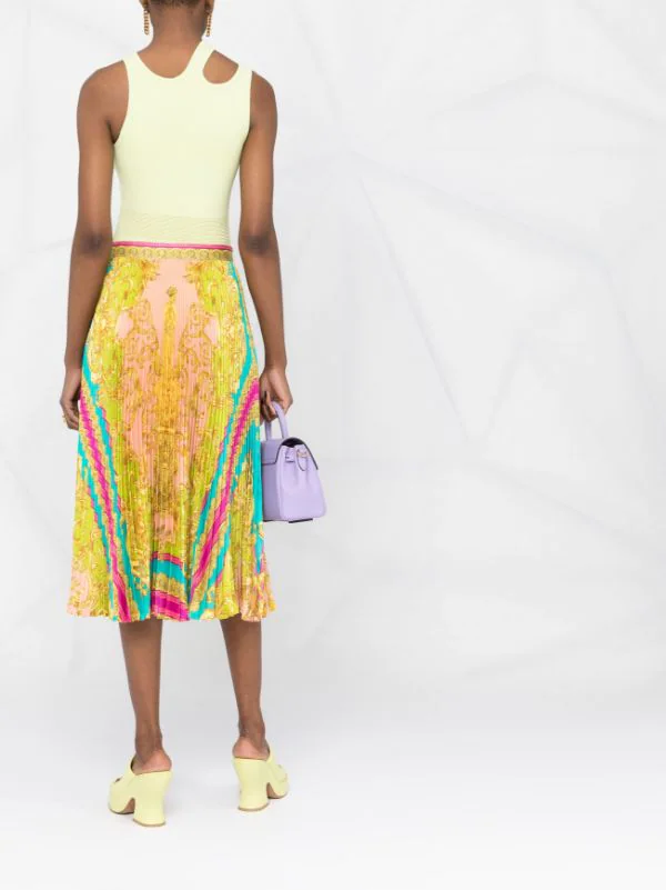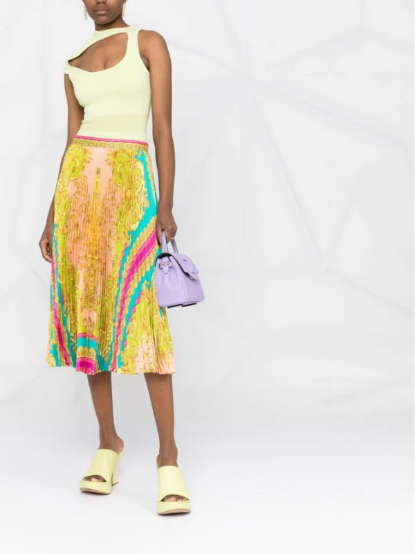 Design plissé, taille haute, coupe trapèze, ourlet incurvé, coupe mi-longue.