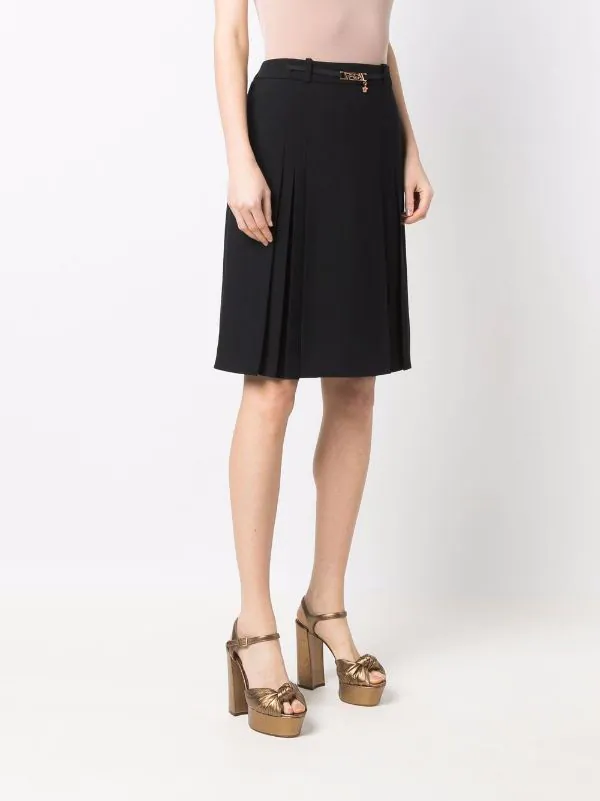 Détail Medusa, motif Greca signature imprimé, finitions en métal doré, taille haute, détails de plis. Couleur : noir. Matière : soie.