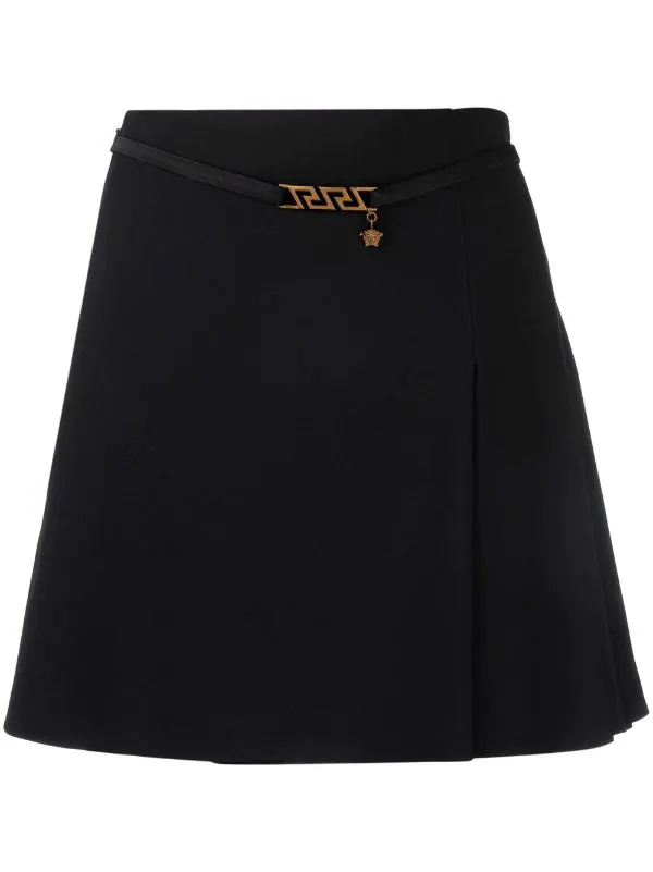 Imprimé La Greca signature, finitions en métal doré, coupe trapèze, taille haute, détails de plis, ourlet incurvé, longueur au dessus du genou. Couleur : noir.