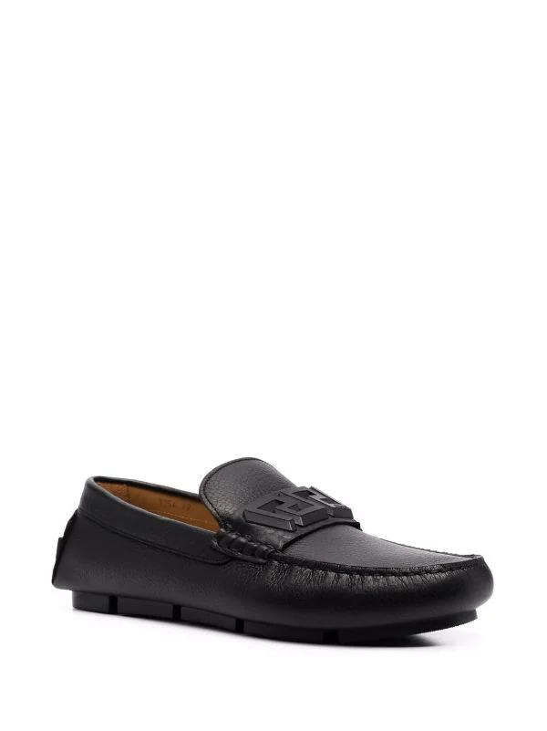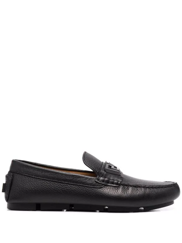 Texture grainée, détail Greca signature, bout rond, semelle intérieure griffée, design à enfiler. Couleur : noir. Matière : cuir.