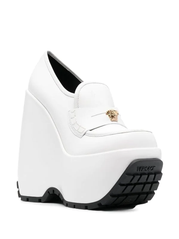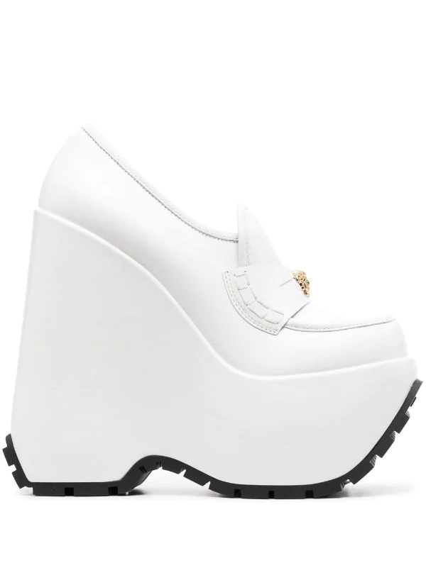 Blanc, cuir, détail Medusa, semelle intérieure à logo, bout carré, talon compensé haut, semelle à plateforme.