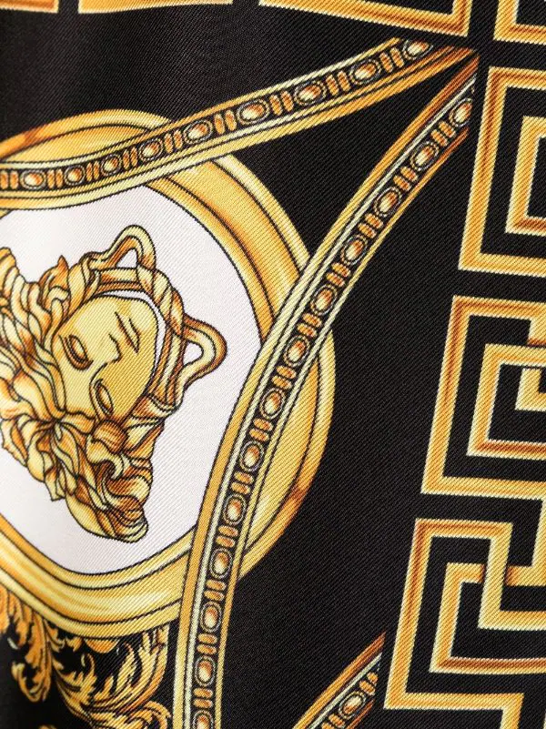 Fini satiné, motif Medusa, motif baroque, ceinture élastique. Matière : soie.