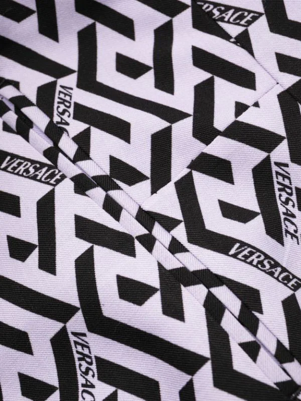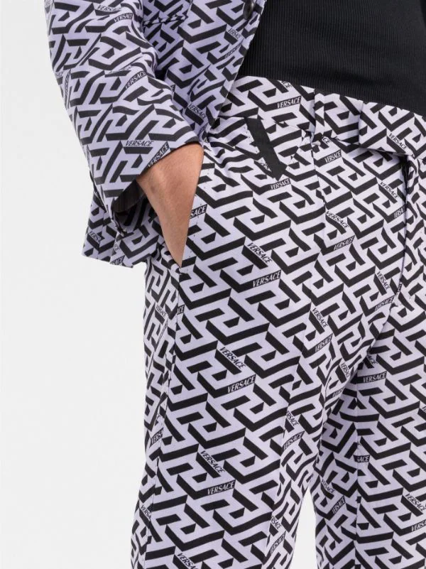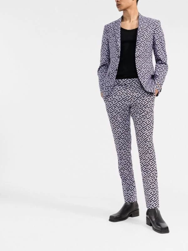 Imprimé La Greca signature, coupe classique, taille mi-haute, coupe slim, boutonnière décalée sur le devant, deux poches latérales fendues, poches arrière passepoilées.