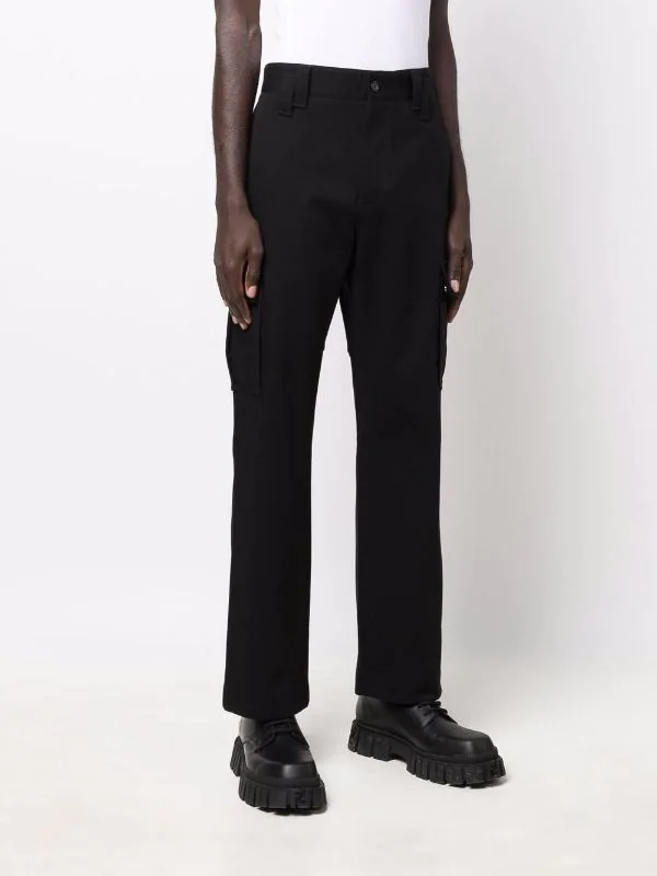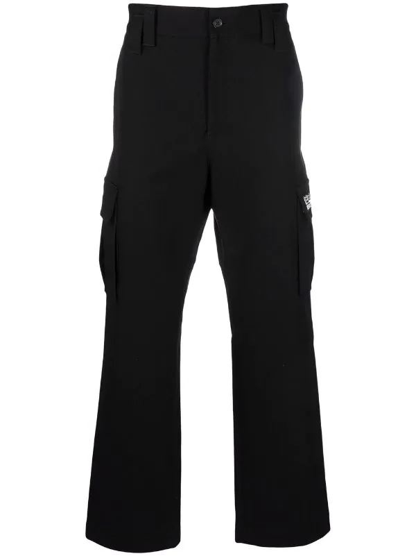 Finition à bande logo, passants de ceinture, fermeture à zip et boutons sur le devant, deux poches latérales fendues, poches latérales cargo, poches arrière passepoilées. Couleur : noir.