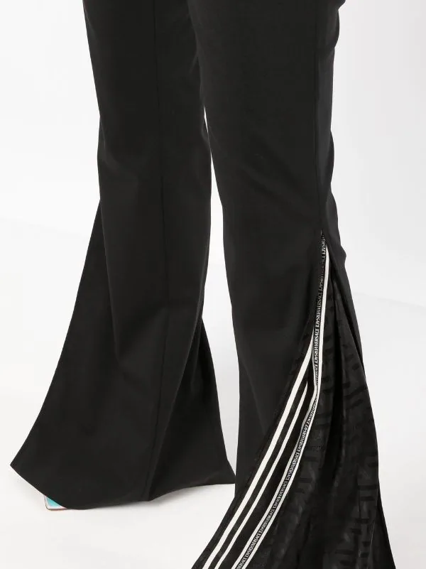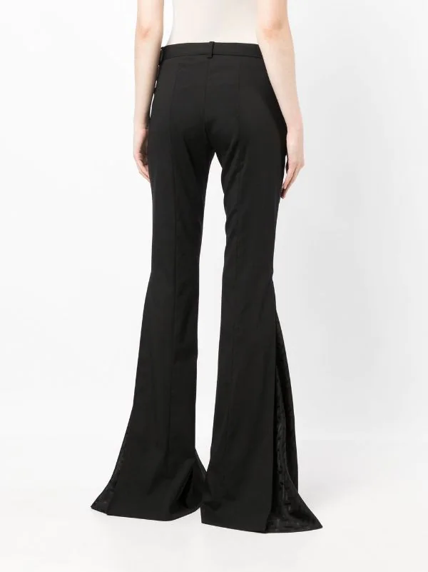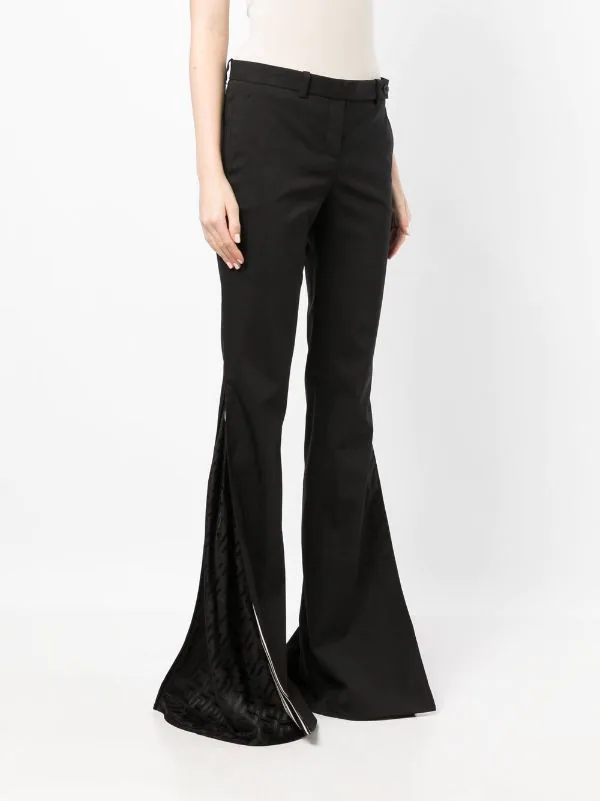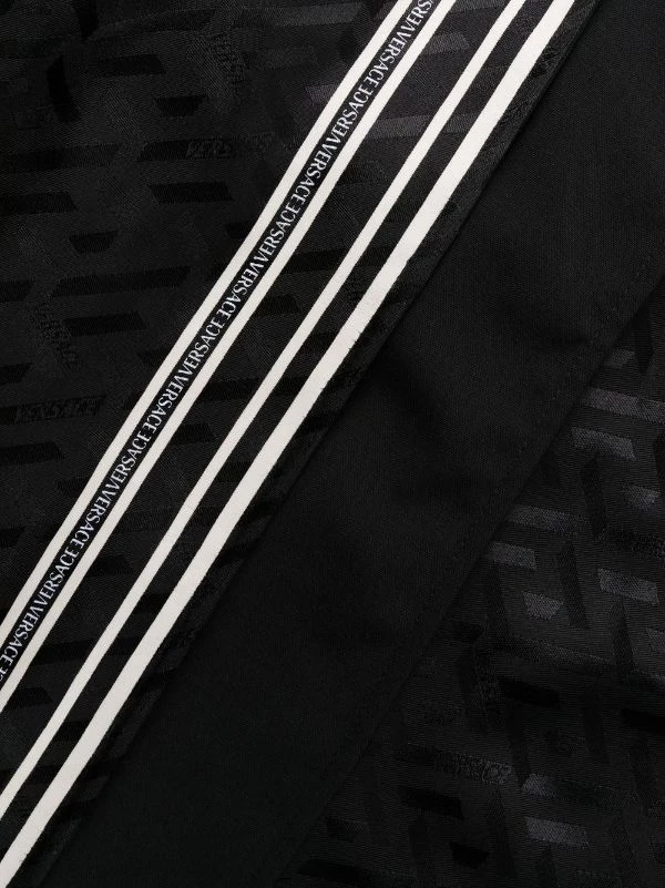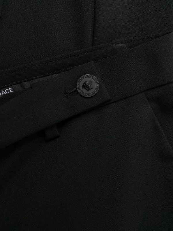 Noir, laine vierge, imprimé La Greca signature, taille basse, passants de ceinture, fermeture dissimulée sur le devant, poches plaquées latérales, coupe évasée.